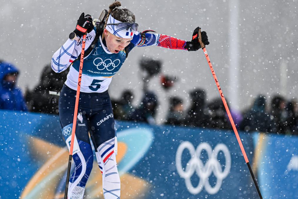 Oceane Michelon of France competes during the biathlon women's 12.5km mass start event at the 2026 Milan-Cortina Winter Olympics in Anterselva, Italy, Feb. 21, 2026. (Xinhua/Jiang Han)