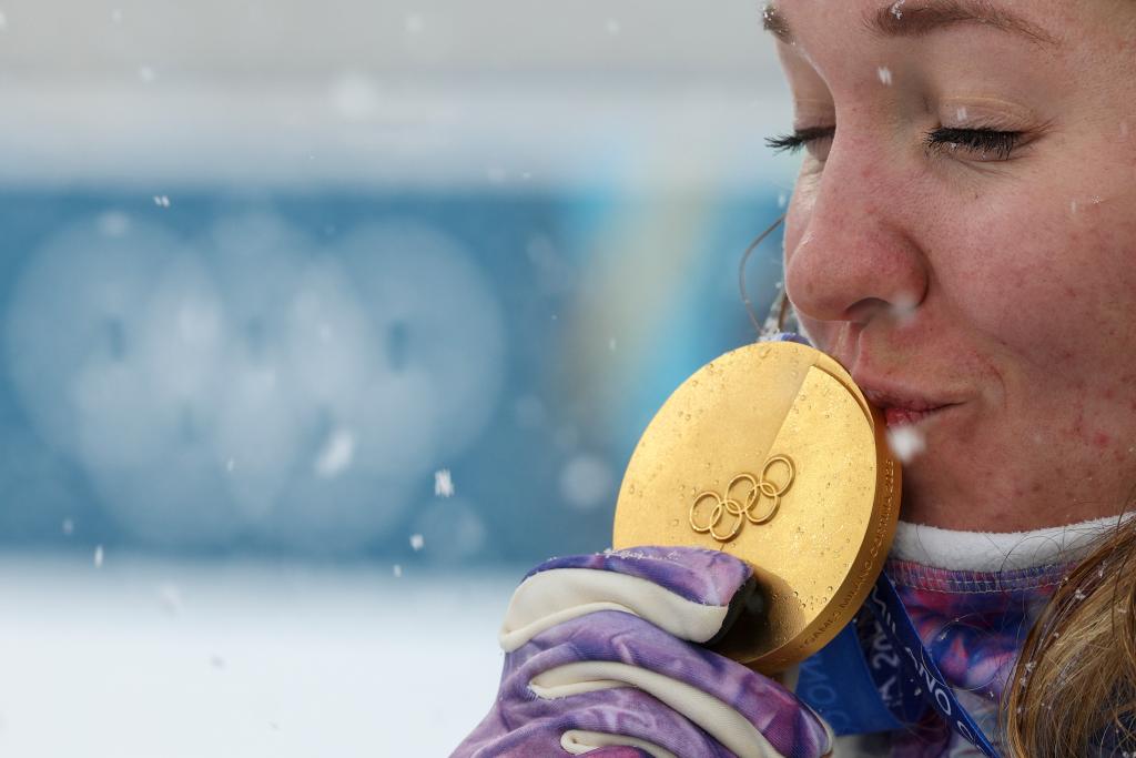 Gold medalists Oceane Michelon of France kisses her medal during the awarding ceremony of the biathlon women's 12.5km mass start event at the 2026 Milan-Cortina Winter Olympics in Anterselva, Italy, Feb. 21, 2026. (Xinhua/Zhang Tao)