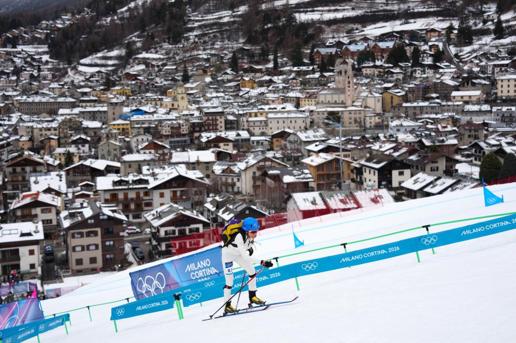 Cidan Yuzhen of China competes during the ski mountaineering mixed relay event at the Milan-Cortina 2026 Olympic Winter Games in Bormio, Italy, Feb. 21, 2026. (Xinhua/Yan Linyun)
