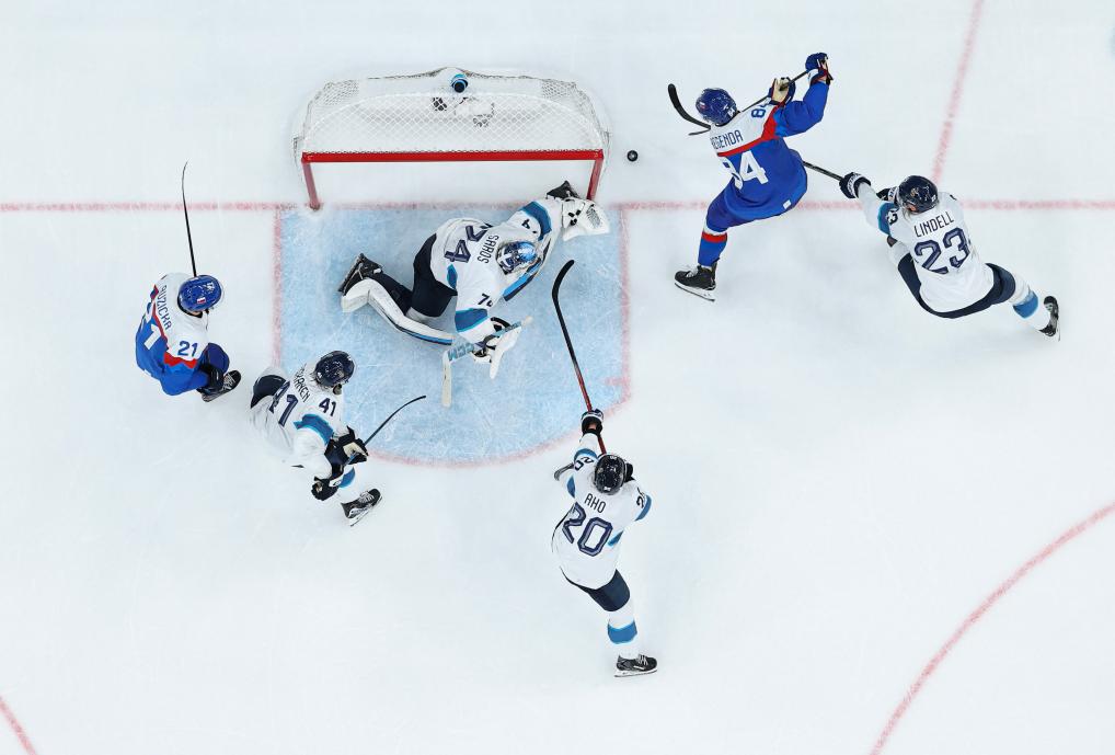 Pavol Regenda (top, 2nd R) of Slovakia shoots during the ice hockey men's bronze medal game between Slovakia and Finland at the Milan-Cortina 2026 Olympic Winter Games in Milan, Italy, Feb. 21, 2026. (Xinhua/Zhang Haofu)