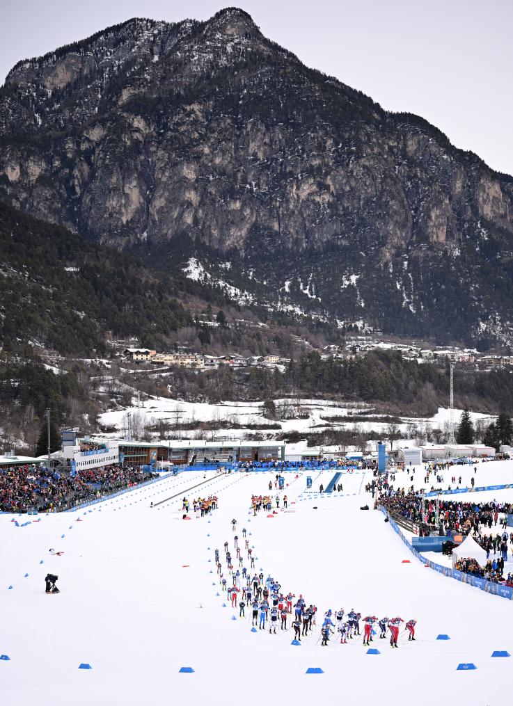 Athletes compete during the cross-country skiing men's 50km mass start classic match at the Milan-Cortina 2026 Olympic Winter Games in Tesero, Italy, Feb. 21, 2026. (Xinhua/He Canling)