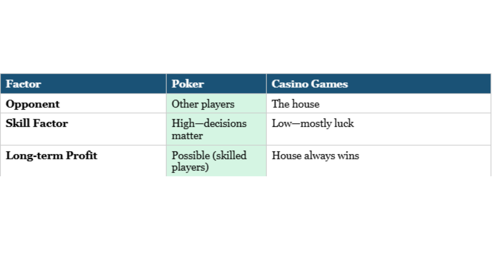 Poker pits you against other players—skill determines long-term results. Casino games pit you against the house with fixed mathematical edges. Skilled poker players can profit; casino games always favour the house.